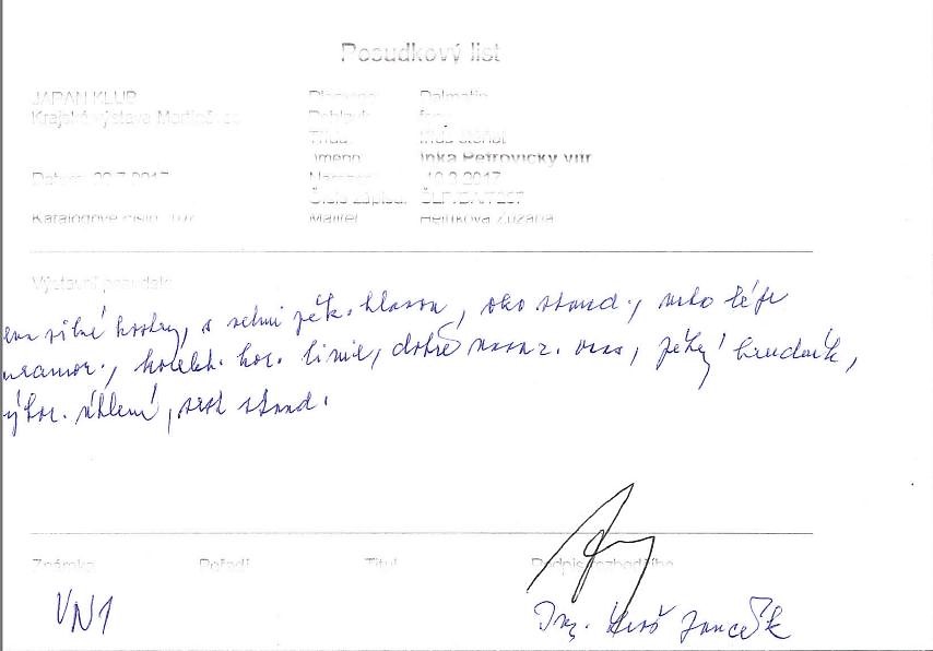"Prohlašuji, že jsem dne 1.5.2017 viděla štěně dalmatina, fenu černě tečkovanou tet. č. 7257, předmětem nejistoty poradců chovu Ing. E.Liškové a E.Dragović., je tmavá špička levého ucha, která nevykazuje známky nežádoucí pigmentace nazývané plotna, dle mého hodnocení."