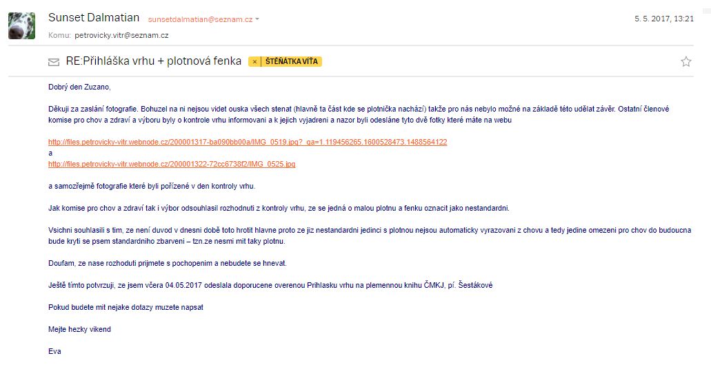 "Poradci" nakonec nerozhodli, fena byla focena a fota následně předložena Komisi pro chov a zdraví při DK ČR z.s. Tato neodborná komise na kontrole nebyla, ani fenu neviděla. Přesto rozhodla, že fena je nestandartní pouze na základě fotek z mého webu z 20.-tého dne věku štěňat. (*Štěňata dalmatinů se rodí bílá, od 7.-9. dne se začínají vybarvovat, viz. Stadart plemene + Biografie Dalmatin od Ing.Jana Findejse.)
