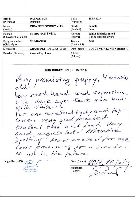 Dne 20.7.2017 byla INKA popsána panem ÁKE CRONANDEREM ze Švédska ( Mezinárodní rozhodčí FCI + Rozhodčí-Expert WAFDAL, Specialista na plemeno a chovatel Chs Albicans. Dalmatiny chová od roku 1970, stejnou dobu i posuzuje).